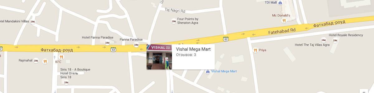 Есть нормальный супермаркет на главной улице – ниже на карте метка) – на втором этаже культурно продаются напитки снеки. VISHAL MART имеется рядом со станцией Агра Кант и рядом со станцией Агра Форт. Алкоголь в Агре продается в 1-2 местах с двухкратной наценкой из-за сухого закона в Индии – мы видели одну такую вино-водочную лавку по пути к восточным воротам Таджа.
