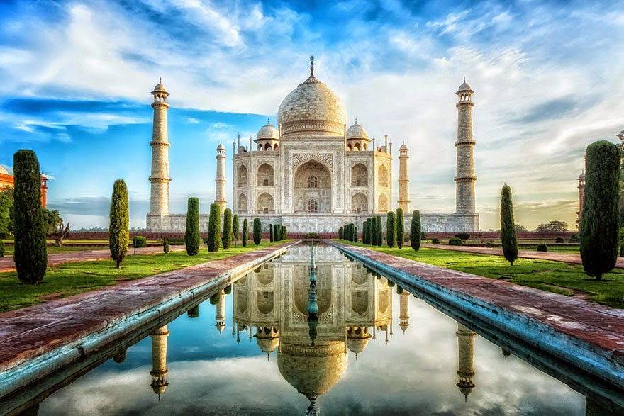 Этот мраморный мавзолей цвета слоновой кости на южном берегу Ямуны строился около 22 лет между 1631 и 1648 годами почти 2000 ювелирами вместе с рабочими по приказу императора Великих Моголов Шаха Джахана. Тадж-Махал на самом деле является гробницей, в которой находится тело его жены Мумтаз Махал, построенное им с целью показать оду своей любви к ней. Архитектурный стиль памятника представляет собой смесь индийского, исламского и персидского стилей.
