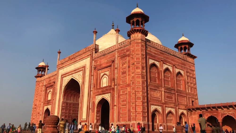 Главные ворота Тадж-Махала настолько красивы, что на этот раз вы не сможете решить, зайти внутрь или просто полюбоваться его красотой, стоя там. Он был построен из красного песчаника с использованием арабской каллиграфии (из Священного Корана), виноградные лозы в нишах и переплетенные листья цветов.