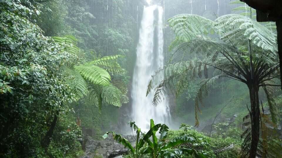 Подъехать близко к водопаду Нунгнунг нельзя, поэтому часть пути к нему пришлось идти пешком. И здесь нас ждал огромный сюрприз в виде тропического ливня. За несколько секунд мы промокли насквозь. Взятый напрокат в одном из придорожных магазинчиков зонт нам уже был не нужен.