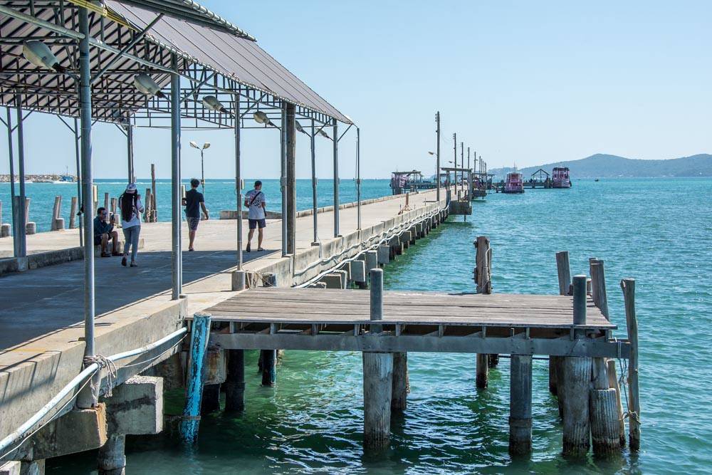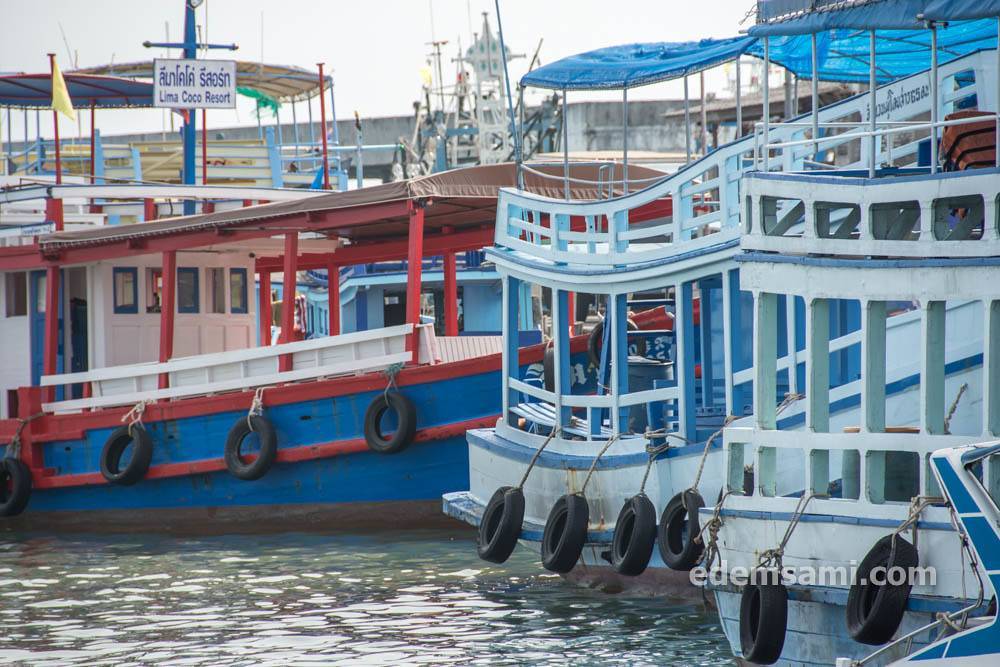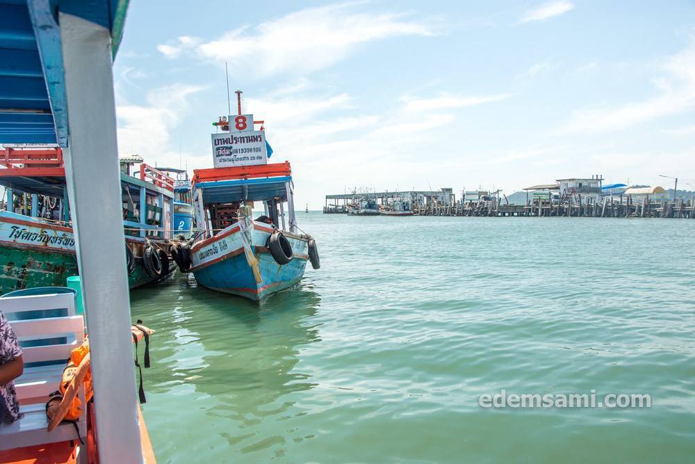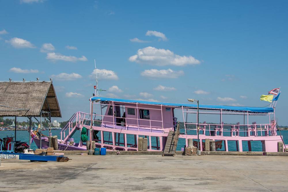 Минибас приезжает на причал Sri Ban Phe Pier, с которого отправляются и паромы, и спидбоаты. Минибас останавливается на парковке около билетной кассы, и сразу же налетают продавалы билетов. Цену предлагают слегка завышенную, нужно торговаться.
