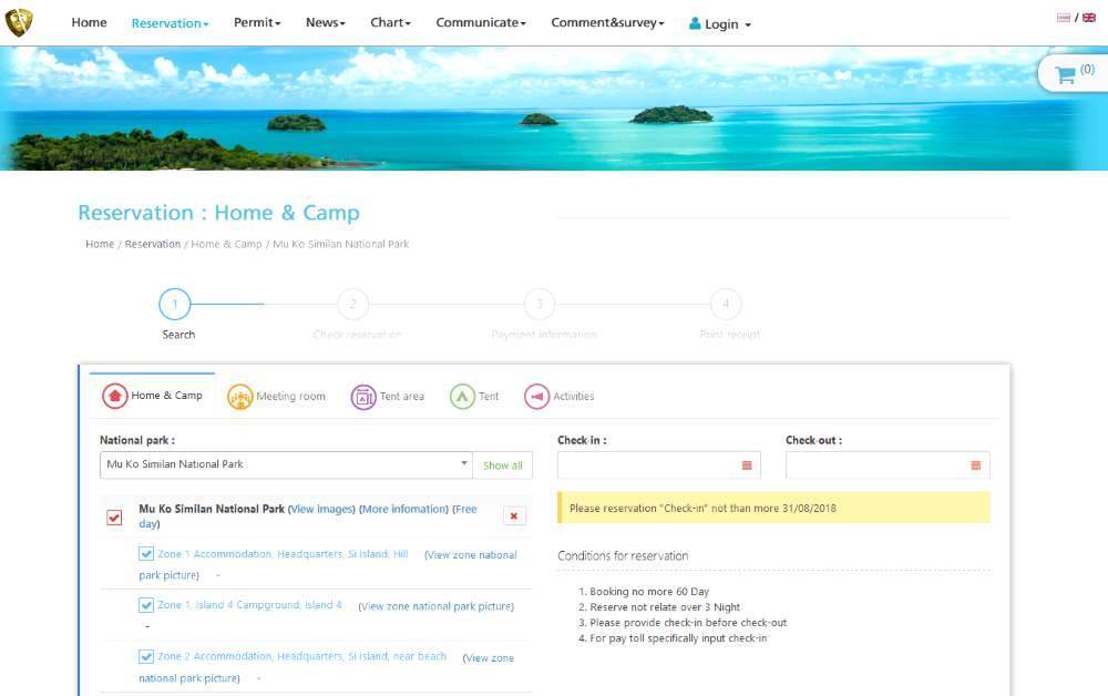 В Таиланде существует сайт, посвященный национальным паркам страны, в т.ч. Симиланским островам: http://nps.dnp.go.th Необходимо зайти на его первую страничку и в меню в разделе «Reservation» найти парк Му Ко Симилан (Mu Ko Similan).