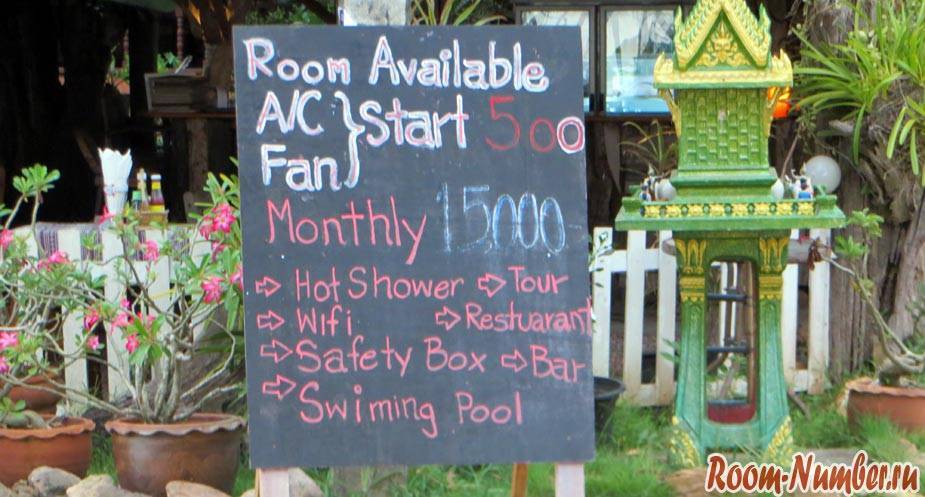 Что касается цен на жильё, то в среднем нормальный отель с горячей водой и кондиционером в пешей доступности от моря будет стоит около 800-1000 бат в сутки. Есть комнаты с вентилятором по 500 бат в соломенных бунгало или в гестах. Также видели вывеску прямо напротив пляжа — комната на месяц за 15 тыс бат.