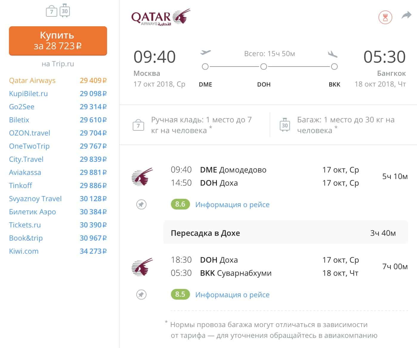 Прямой рейс авиакомпании Qatar Airways стоит 47 тысяч рублей. Известно также, что Доха — это транзитный пункт и Qatar очень часто предлагает скидки, за стыковку в этом месте. Попробуем поискать любой билет со стыковой в Дохе этой же авиакомпании. Например Москва — Бангкок.