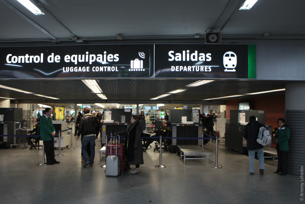 Аэропорт Мадрида страшно красив, несмотря на то, что огромен как ужасные аэропорты Рима и Пекина. Весь свет отражается от висящих на потолке фасетчатых зеркал, а металлические опоры покрашены разными цветами с незаметным шагом. Начинаешь идти по желтому коридору, а потом незаметно оказываешься в синем.