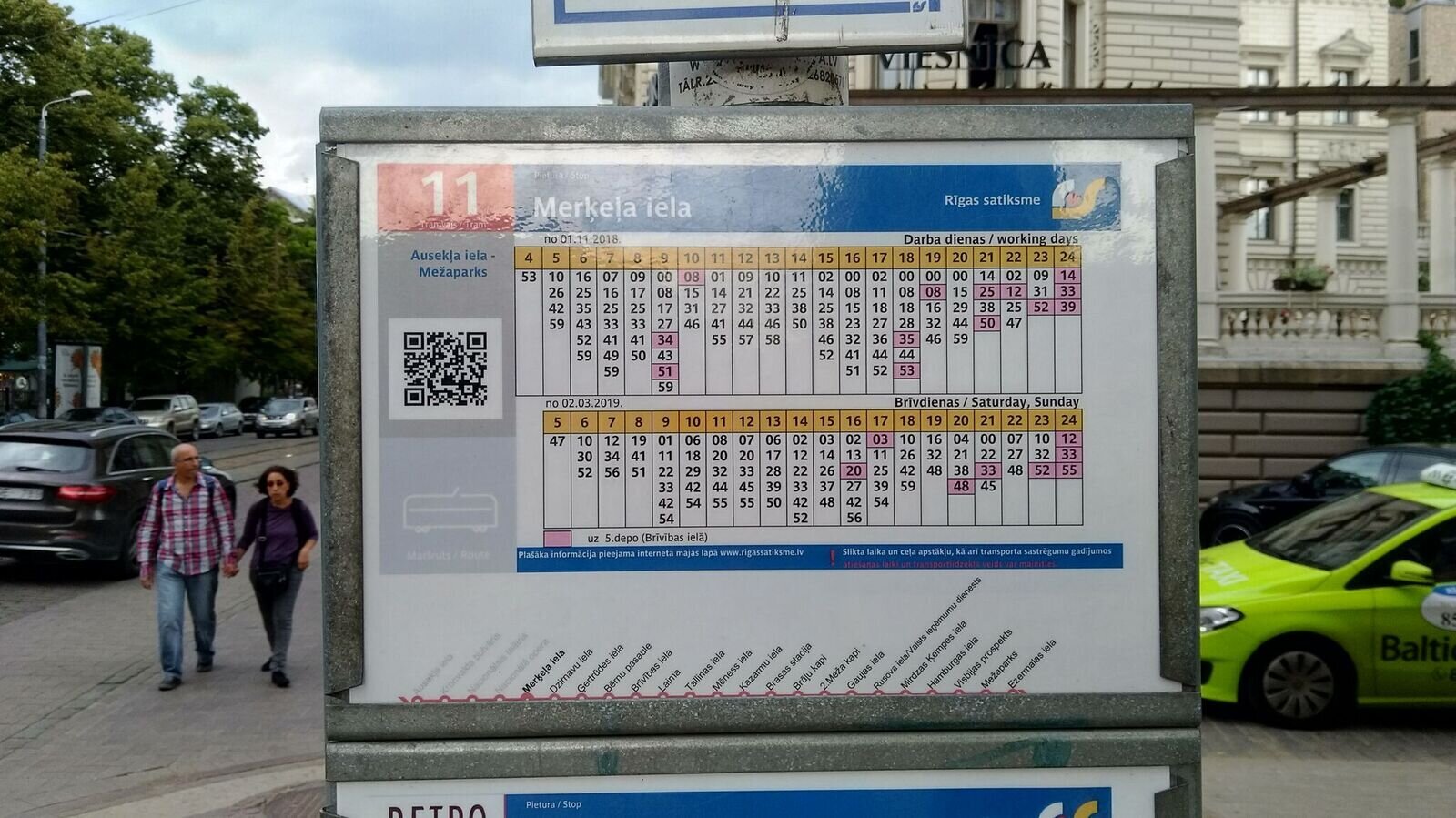 На остановках общественного транспорта в Риге есть расписание и маршруты. Автобусы курсируют каждые 10—15 минут, трамваи — 7—10 минут. В салоне на электронное табло отображается текущая и следующая остановка. Дополнительно остановки озвучивает программа.