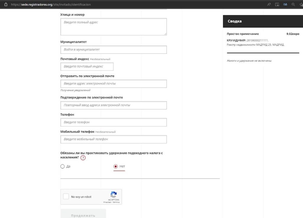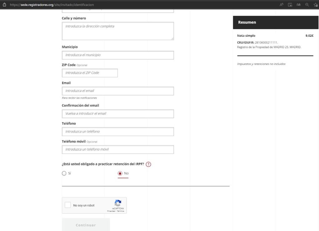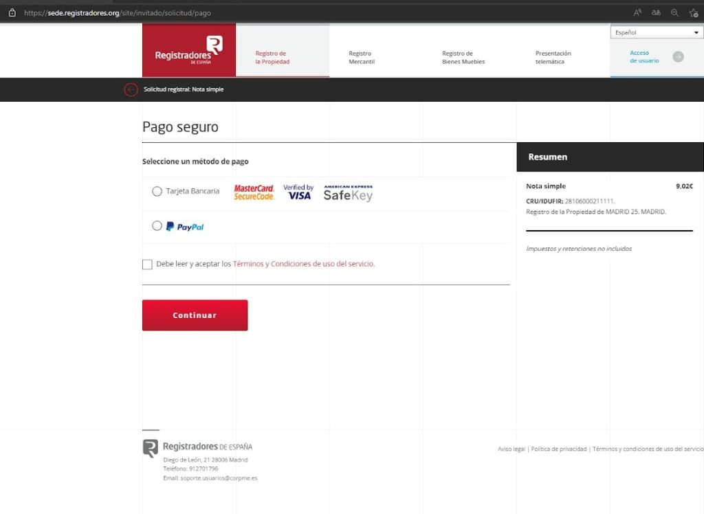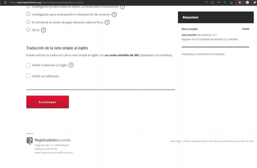 Далее предлагается запросить перевод Nota Simple на английский язык с дополнительной стоимостью 30 € без учета налогов (traducción al Inglés). При необходимости поставьте галочку. Нажмите продолжить (Continuar).