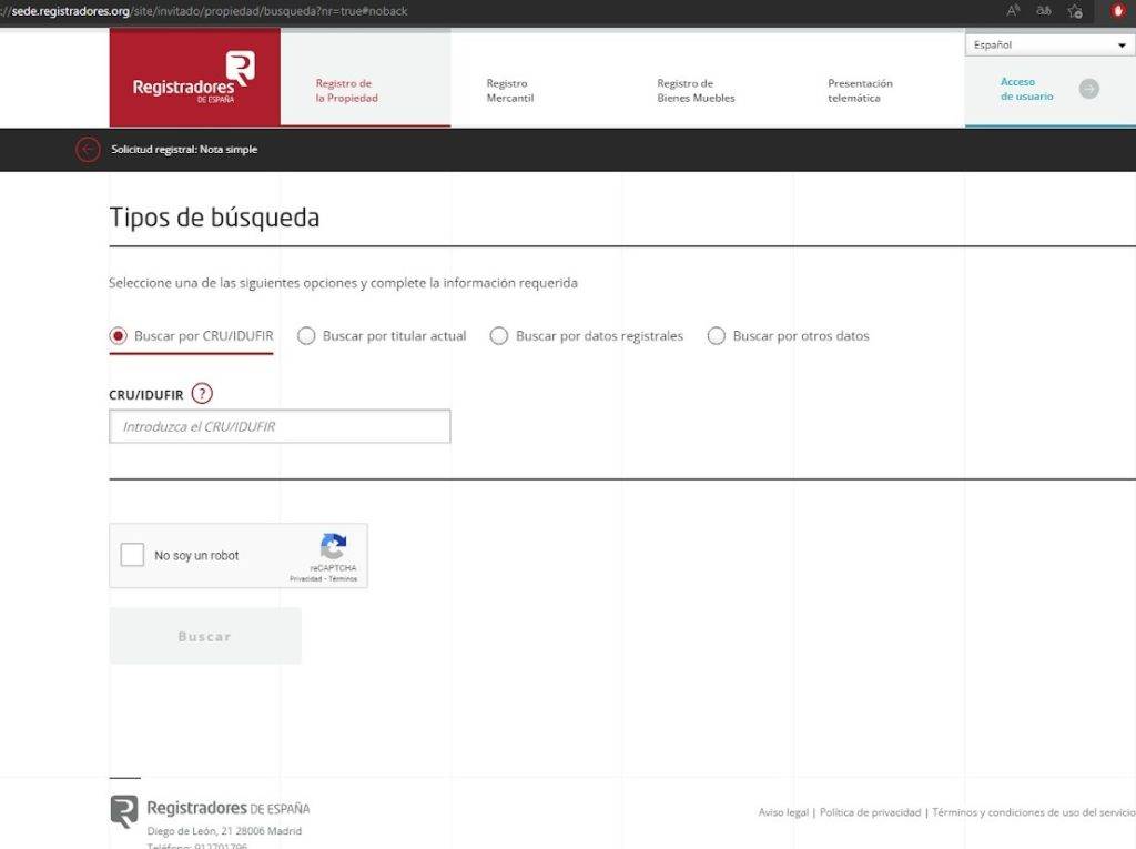 2. Далее нужно выбрать способ поиска вашего недвижимого объекта: по CRU/IDUFIR, по данным о владельце (titular actual), по регистрационным данным (datos registrales) или по иной информации (otros datos).