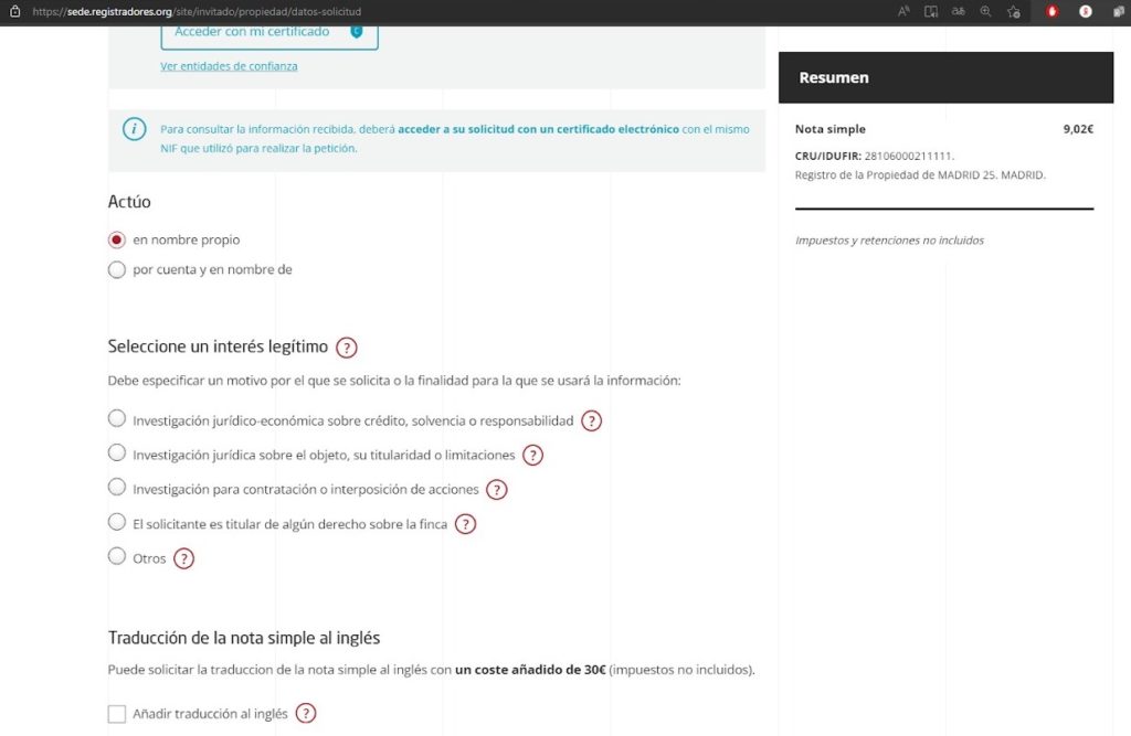 Существует множество онлайн сервисов позвооляющий заказать и получить Nota Simple самостоятельно. Разберем на примере самого популярного сервиса Registradores.org