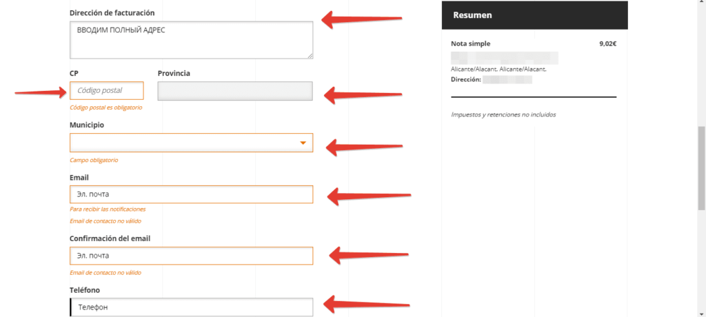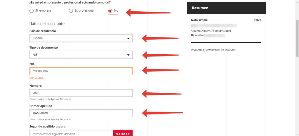 Если Вы являетесь физическим лицом в Испании, то выбираем пункт NO и вводим личные данные.