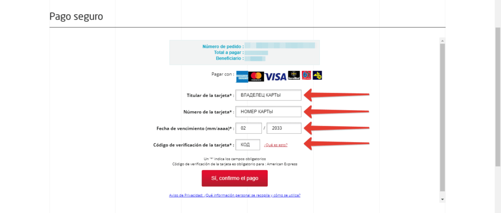 Заполняем данные карты и нажимаем «Si, confirmo el pago».