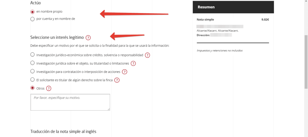 Далее нужно выбрать законный интерес получениявыписки (по-испански «Seleccione un interés legítimo»). Это может быть: