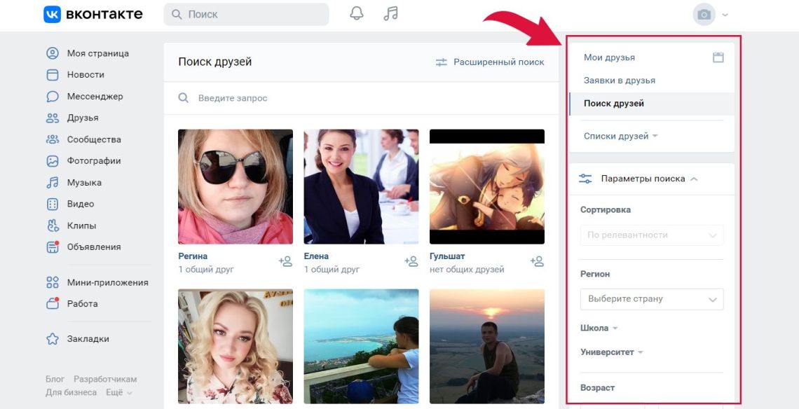 - в столбце справа выберите «Поиск друзей», после чего в том же столбце ниже появится вкладка «Параметры поиска»;