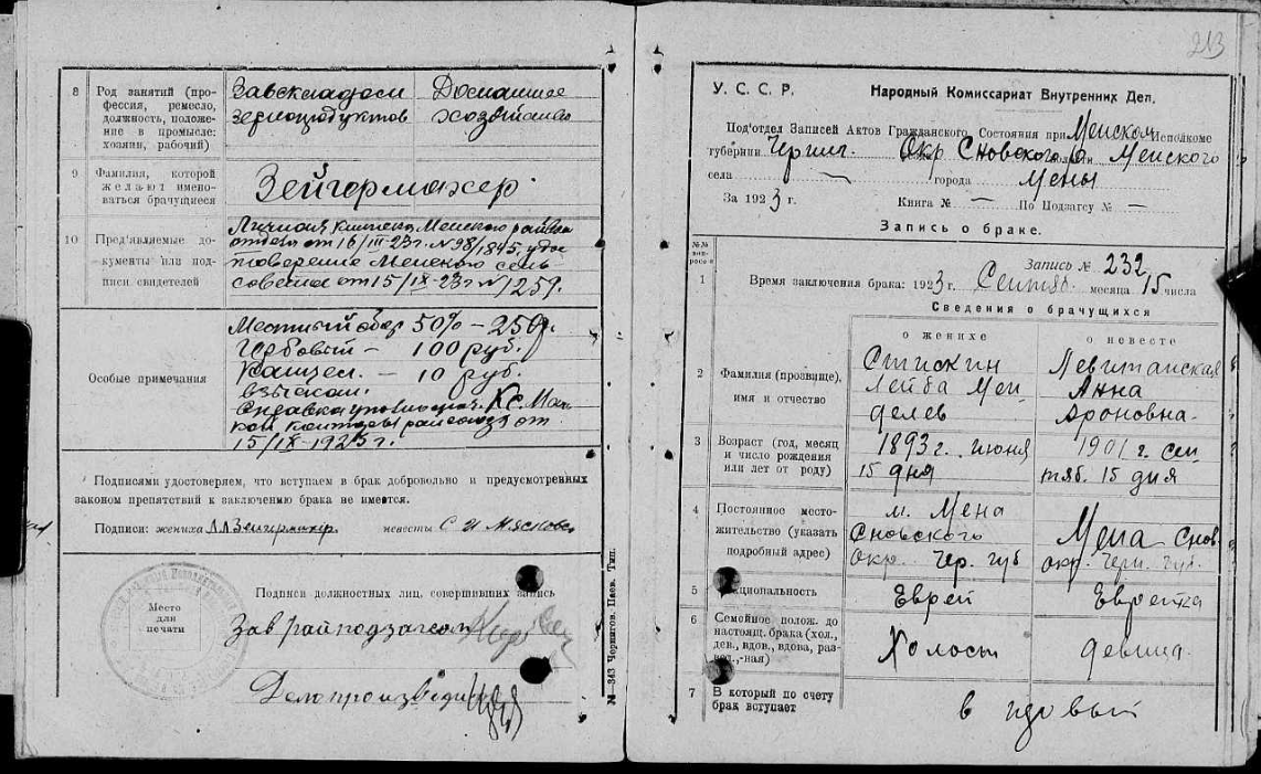 Стискин, Левитанская. Запись о браке евреев 1923 года, Черниговская губерния, Мены