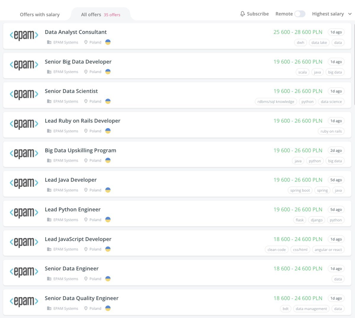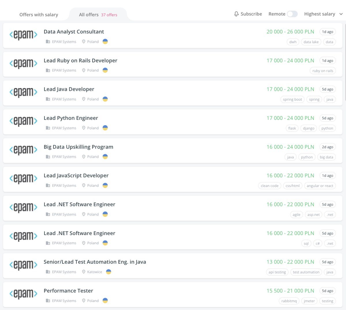 У EPAM в Польше — 37 свежих вакансий, самой старой — 5 дней. Нужны джависты, питонисты, .Net- и JavaScript-разработчики, тестировщики-автоматизаторы, дата-инженеры и др. География вакансий — Гданьск, Катовице, Краков и вся Польша. Кандидат сам может выбрать форму сотрудничества — B2B или трудовой контракт, от этого будет зависеть размер зп.