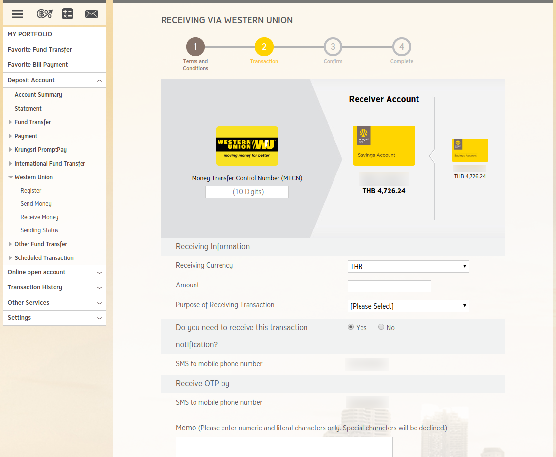 В онлайн банкинге Krungsri есть возможность интеграции с Western Union. Насколько я понимаю, Western Union выполняет некоторые операции с помощью банка Krungsri, поскольку некоторые офисы получения переводов Western Union находятся в Krungsri.