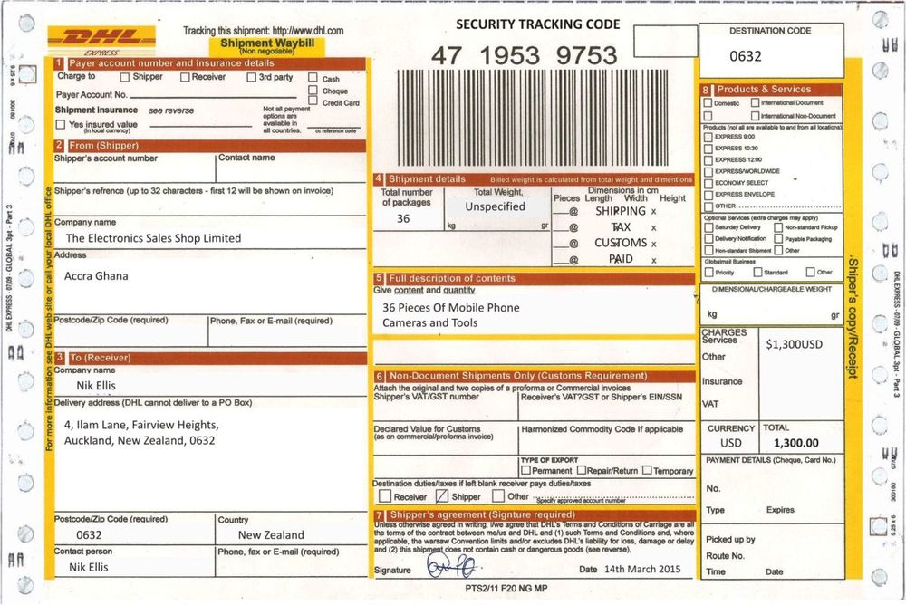 Вот образец накладной, который показывает номер отслеживания DHL — 47 1953 9753.