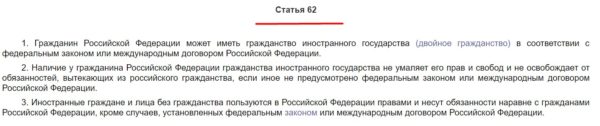 В то же время прямого запрета на наличие второго или множественных гражданств законодательство РФ не содержит; граждане, имеющие несколько паспортов различных государств одновременно, просто должны уведомлять об этом Главное управление по вопросам миграции МВД РФ. Но с точки зрения закона на российской территории госорганы рассматривают таких лиц как граждан России.