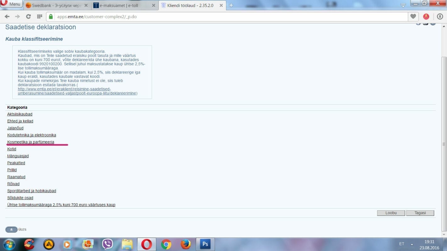 Нужно выбрать категорию товара , который находится в вашей посылки… и что самое интересное, категории БАДы я не нашла, хотя писать , что у вас там БАДы я вообще не советую. Могут нос сунуть и вообще конфискуют половину, потому что 100% в Эстонию ввоз половины тех бадов, что мы заказываем, запрещен. Поэтому я выбираю в меню Космеееетика и парфюмерия.