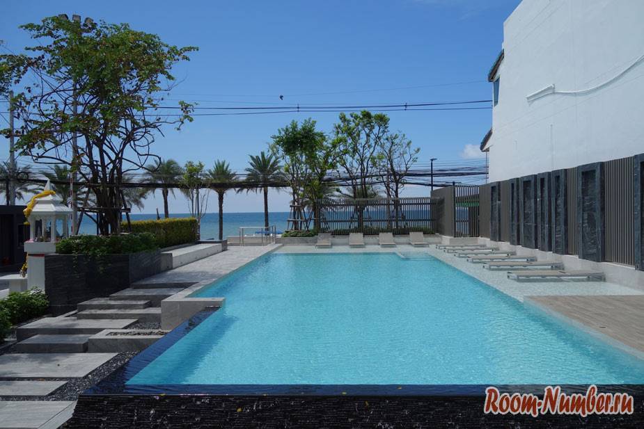 При входе на территорию тебя уже ждет небольшой, но классный бассейн. Водичка чистая, теплая даже в дождливую и облачную погоду. Плитка на дне приятная для ног и безопасная для купания. Кондоминиум Аерас в Паттайе пока не пользуется большой популярностью среди туристов, о нем еще мало кто знает, а значит больше свободного пространства и больше шансов плавать в бассейне совершенно одним. Прям всё как мы любим