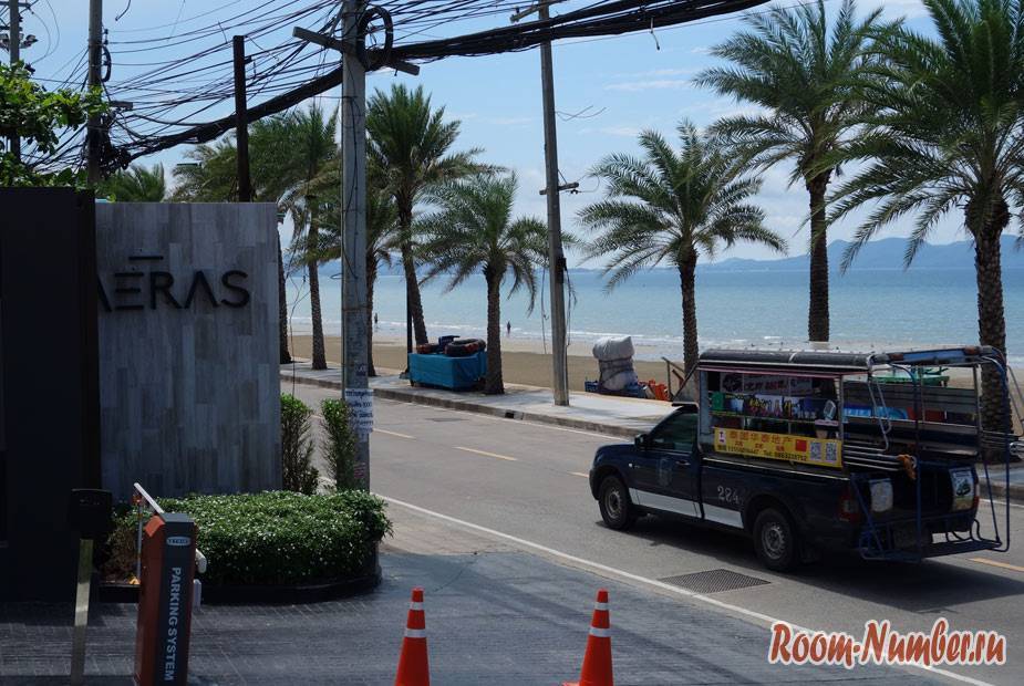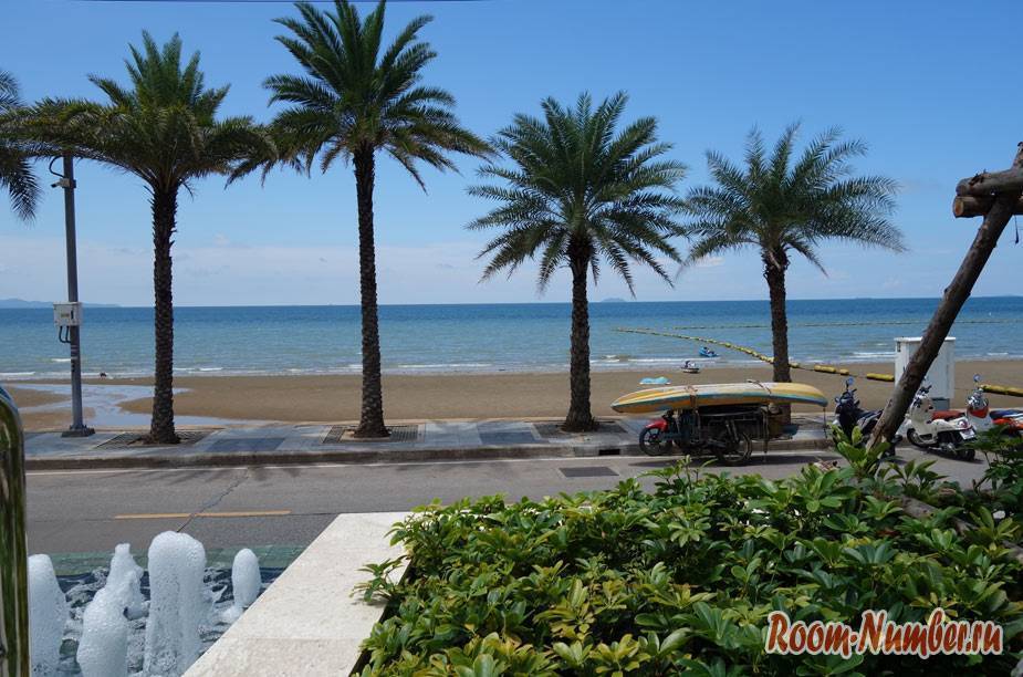 До моря нужно только перейти через дорогу со слабым движением, по которой, кстати, ходят тук-туки в центр Паттайи за 10 бат. Пляж и транспорт у вас под боком.