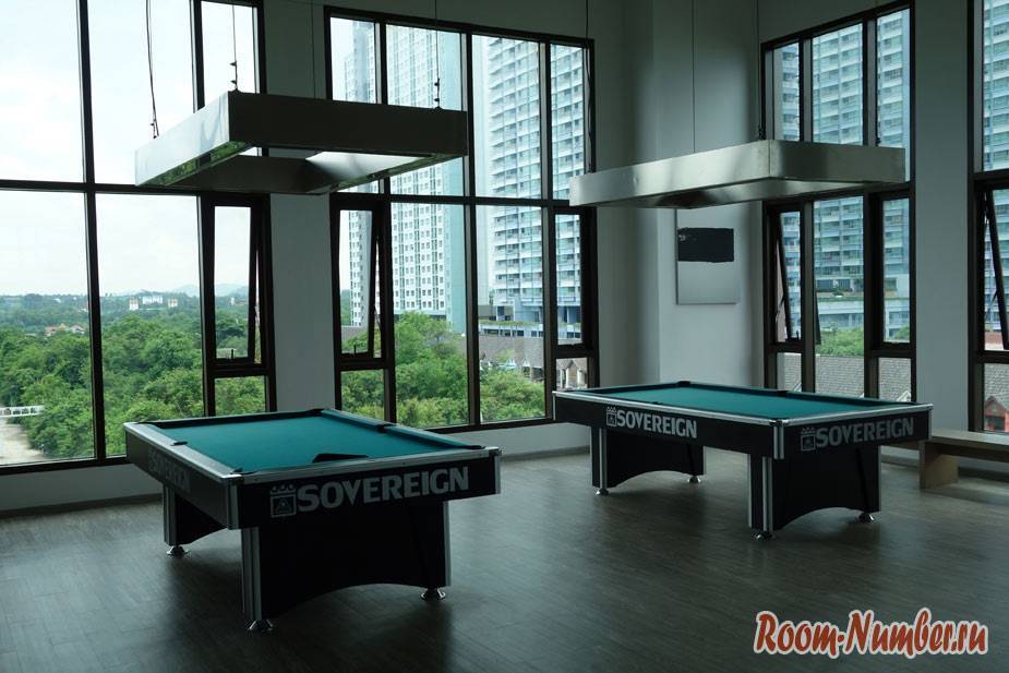 Столы для бильярда без шаров. Необходимо спуститься в офис кондо на первом этаже и взять шары под запись. Отлично придумано, меньше порчи имущества.