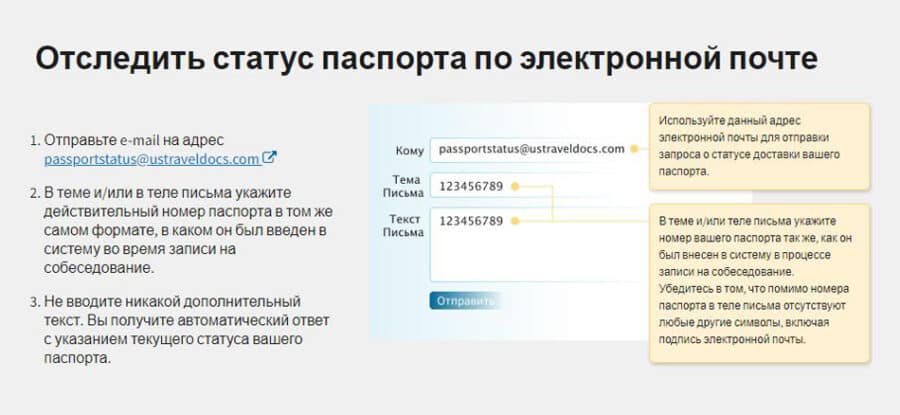 Есть еще один способ проверить местонахождение паспорта с американской визой – отправить запрос по электронной почте в службу визовой поддержки США в России. Для этого вам потребуется написать письмо на электронный адрес passportstatus@ustraveldocs.com