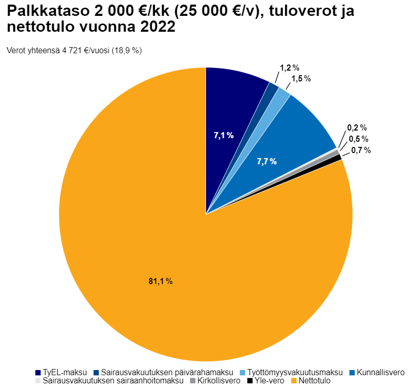 Если уровень заработной платы 2,000 евро в месяц (25,000 евро в год), налоги с зарплаты составят 4721 евро в год или 18,9%.