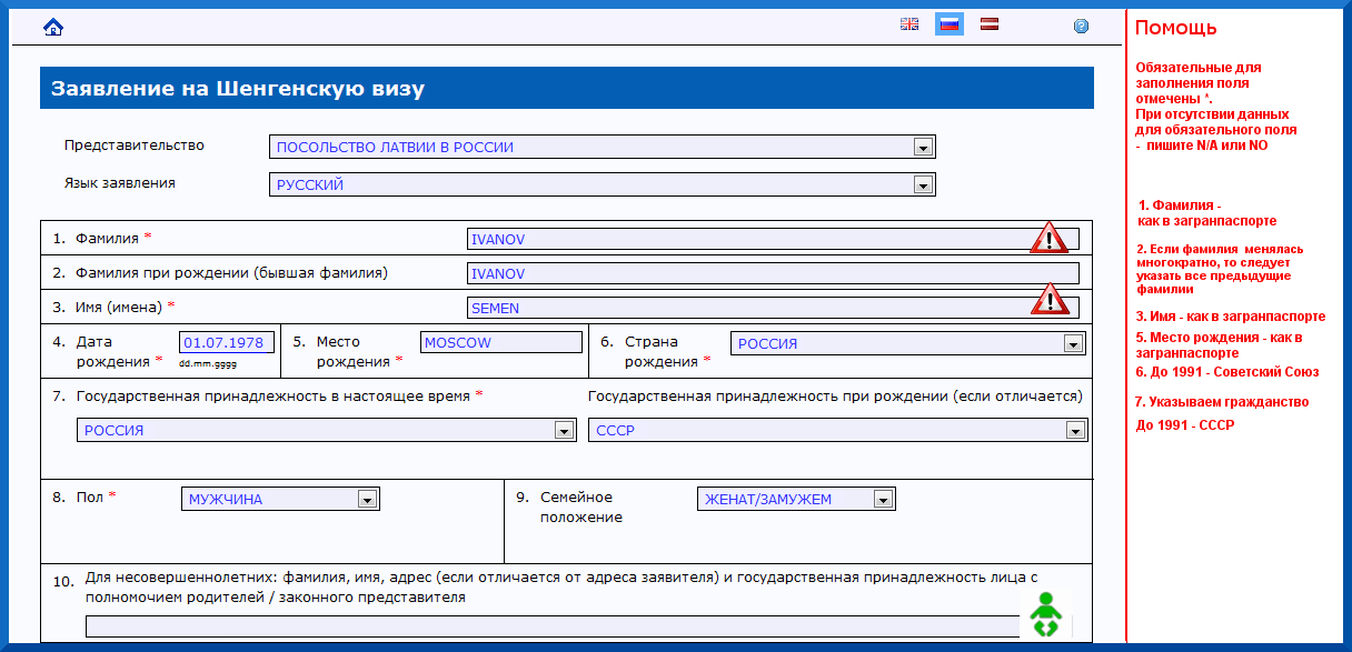 Анкеты для поездки в Латвию можно заполнять как на английском или латышском языке, так и на русском, но латинскими буквами. Ниже вы можете видеть пример заполнения анкет на визы в Латвию, а именно первые пункты анкеты. Как видите, все предельно ясно, вам даже не понадобится полный образец заполнения.