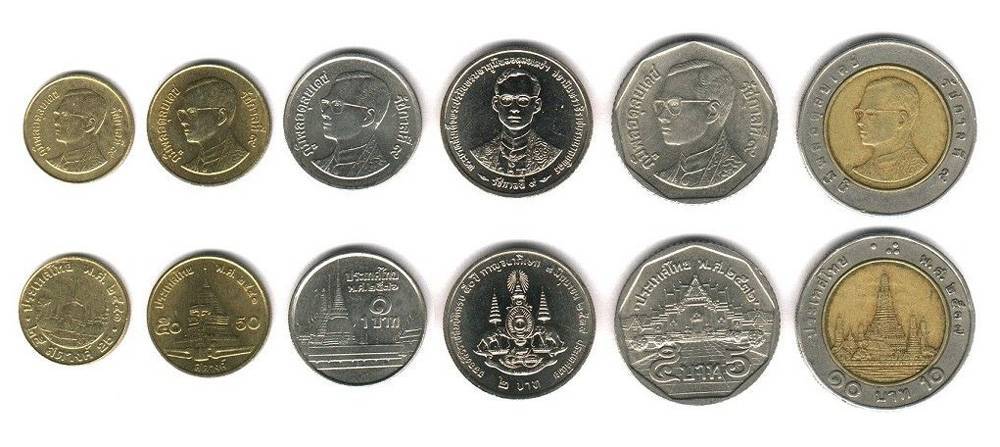 Самой маленькой номинальной стоимостью обладают жёлтые тайские монеты в 25 и 50 бат. Далее идут никелевые монеты в 1 бат, 2 бата, 5 бат. Желтая монета с белой окантовкой в 10 бат, которая выглядит почти как российские юбилейные «десятки», имеет самую высокую номинальную стоимость. Помимо этого монетный двор Таиланда периодически выпускает юбилейные монеты, приуроченные к памятным датам.