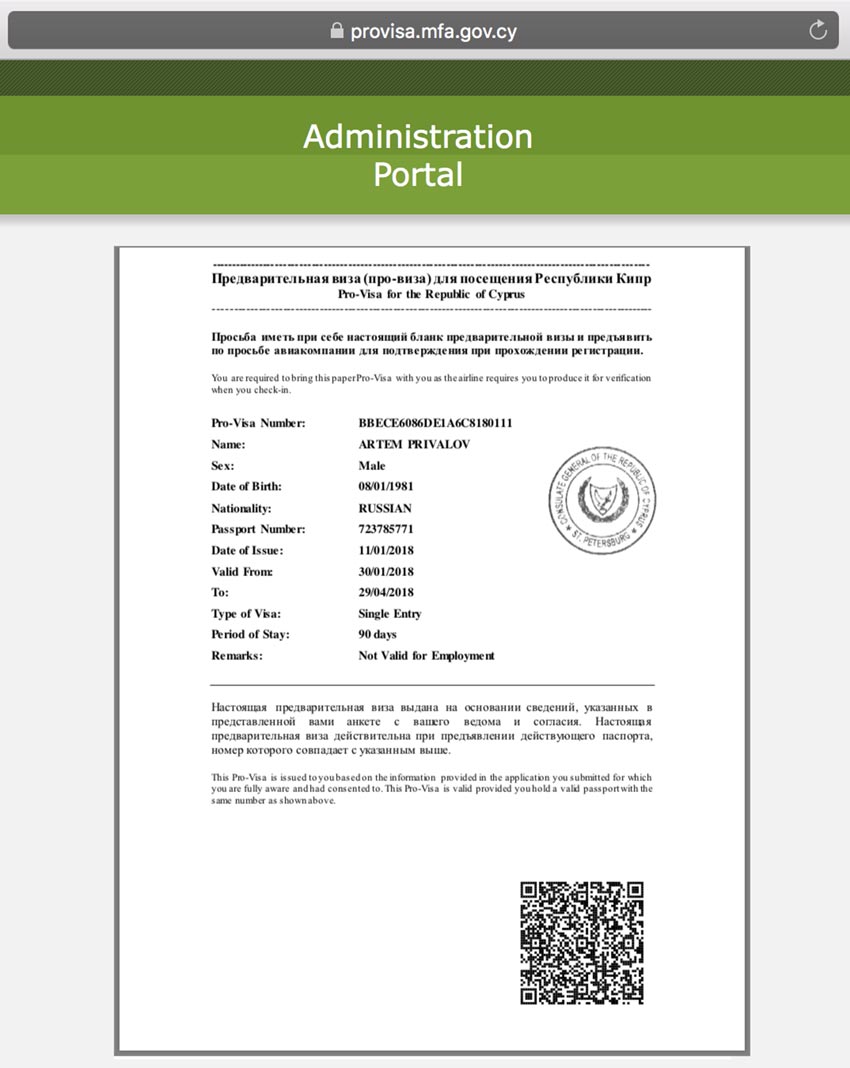 - Про-виза. Это особый упрощенный вид въездного документа, который могут получить граждане РФ, отправляющиеся на Кипр прямым рейсом из России без пересадок. Оформляется такой документ онлайн.