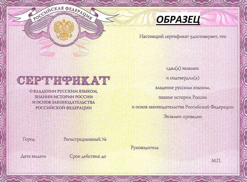 - Сертификат о сдаче экзамена по русскому языку или документ об образовании, полученный до 1991 года на территории СССР.