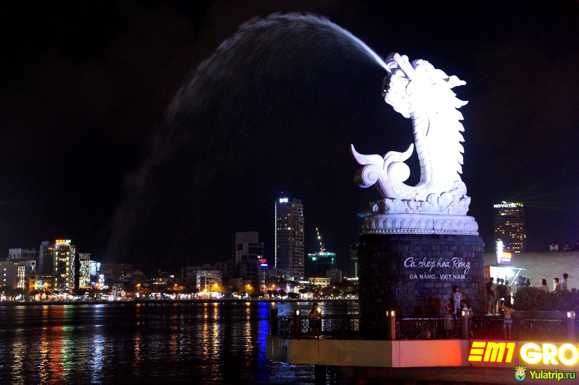 Сама набережная удивила меня тем, что на ней я увидела фигуру Мерлиона — голова льва с хвостом рыбы, точно такая же как в Сингапуре на центральной набережной Марины Бэй. Очень интересно, зачем вьетнамцы сделали копию На набережной жизнь кипит — громко играет музыка, кто-то танцует, кто — то сидит и есть еду, купленную здесь же в ларьках. В общем, если хотите вечером развлечься, приезжайте на набережную, отсюда же вы увидите все красивые мосты Дананга.