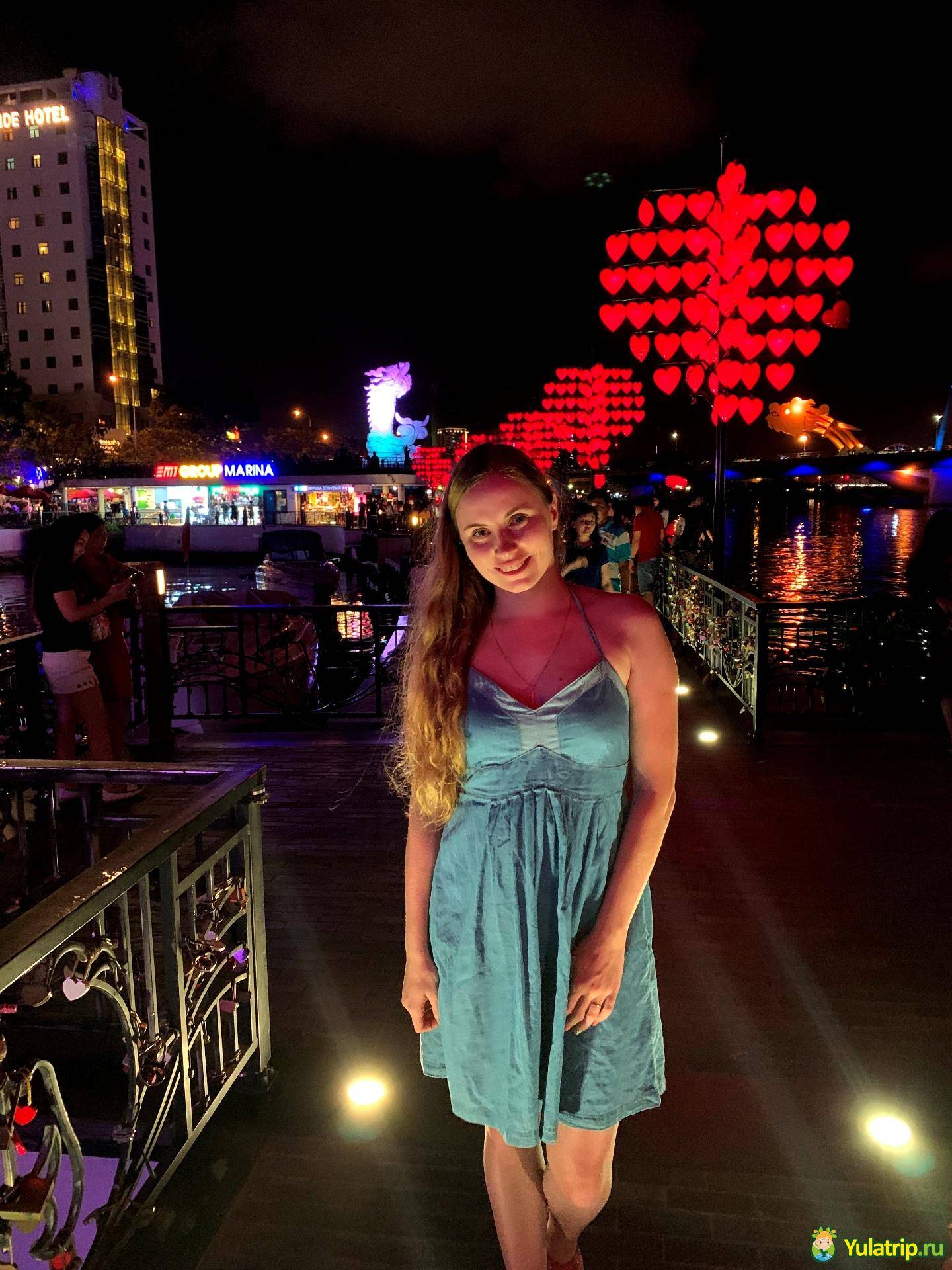 Мост Любви не является мостом между двумя берегами, как это обычно бывает. Мост Любви сделан как часть набережной, в конце которой он действительно проложен по воде на совсем небольшое расстояние — около 100 метров. Его легко можно увидеть, так как на нем расположены красивые светящиеся металлические сердечки. Этот так называемый мост находится на набережной между мостом Хан и мостом Дракона.