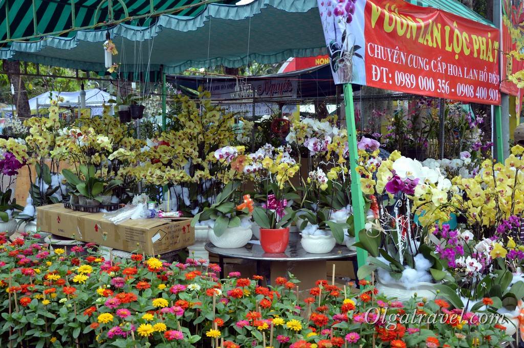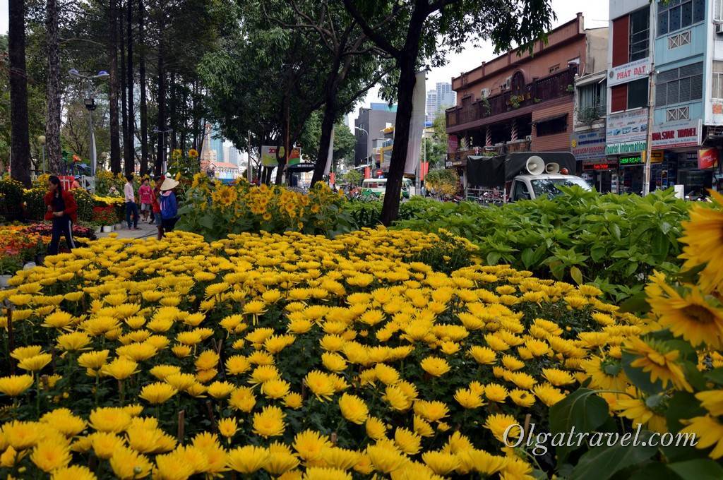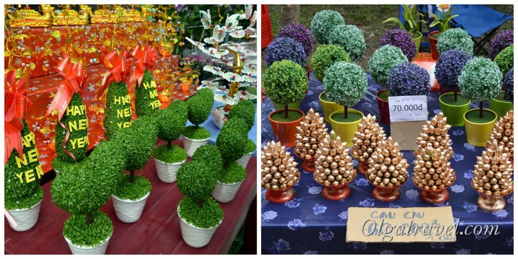 Если у нас на Новый год принято украшать елку, сосну или пихту, то во Вьетнаме пред Новым годом закупают мандариновые деревья, сакуру и другие цветы в горшках. Эти растения ставят возле дома и в комнатах. В Хошимине в сквере на ул. Фам-Нгу-Лао разложился новогодний базар, где можно было прикупить себе дерево / цветок к новому году. Красота неописуемая! Смотрите сами: