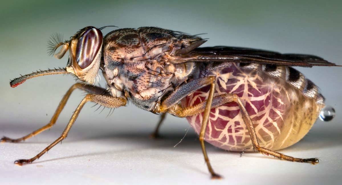 Африканская муха цеце также является опасным переносчиком заразы. В своём роду насчитывает приблизительно 23 вида своего семейства. Внешне цеце ничем не отличается от обычной мухи за исключением небольшого хоботка. Она обитает на территории Африки и среди пустынных массивов Сахары. Цеце является носителем трипаносомозов, которые влекут ко многим заболеваниям, включая главную — сонную болезнь. Эти мухи ежегодно заражают огромное количество людей данной болезнью. Питается она за счёт своего хоботка и выбирает не только людей в качестве своей добычи, но и животных. После укуса паразиты мухи цеце вызывают: спутанность сознания, отсутствие чувствительности и плохую координацию. У животных при паразите такие симптомы как: жар, анемия и слабость. В любом случае если не лечиться от паразитов этой мухи грозит летальный исход.