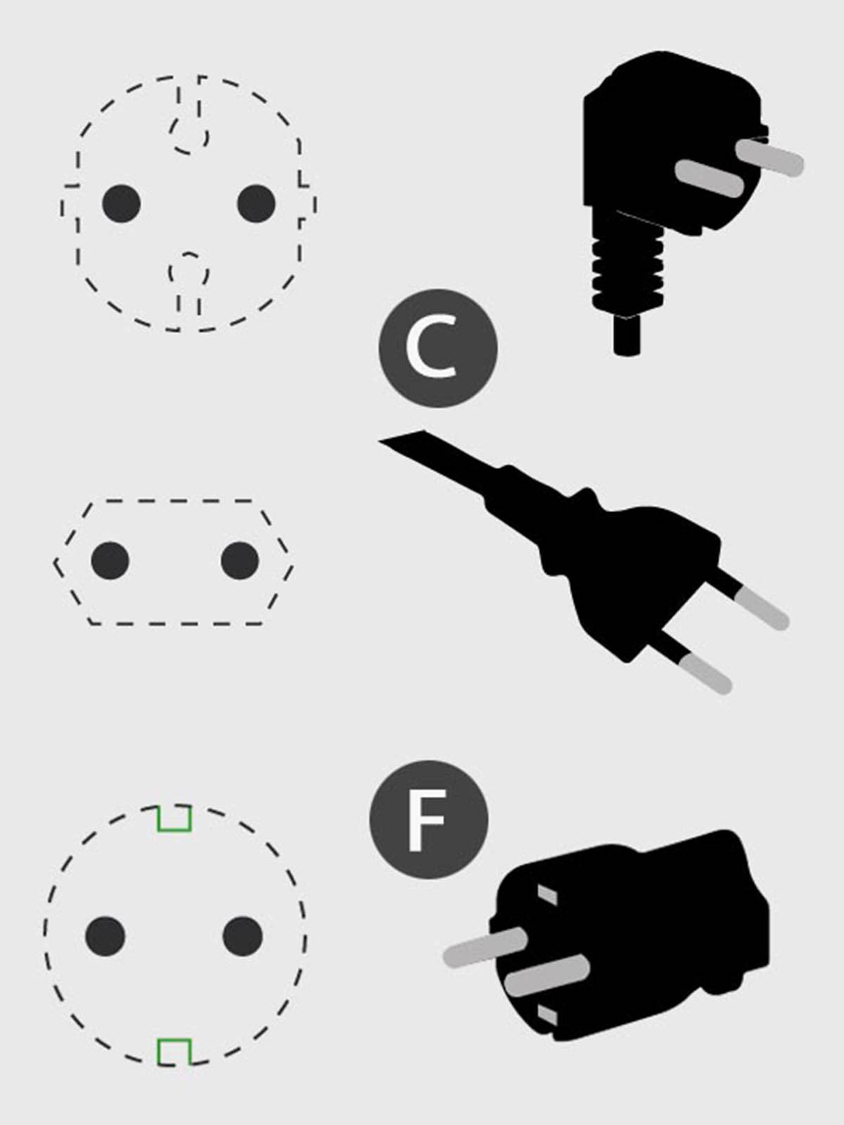 Это привычная нам евророзетка. Заземление не предусмотрено, и вилка может подключаться к любой розетке, которая принимает контакты диаметром 4 мм с расстоянием 19 мм между ними.