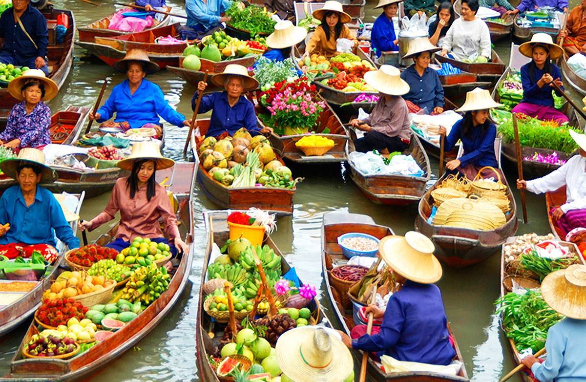 Посетители проплывают на лодках по каналам, причаливая у понравившихся лавочек, и выбирают товары. Можно здесь и поесть, в местных кафе или купив аутентичную тайскую еду у уличных торговцев.