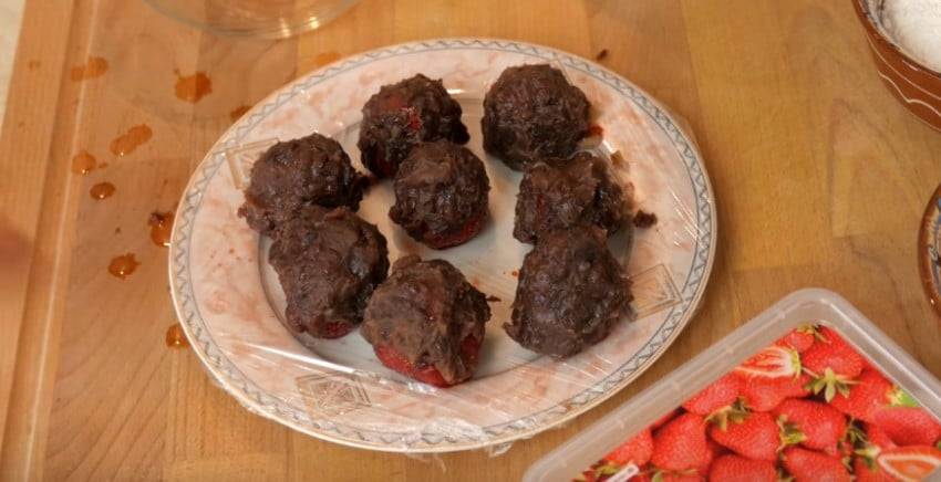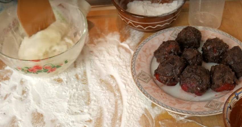 1. Возьмите фасолевую пасту — как ее приготовить я описала в 1-м рецепте. Заверните в неё каждую ягоду клубники. Сформируйте примерно одинаковые шарики.