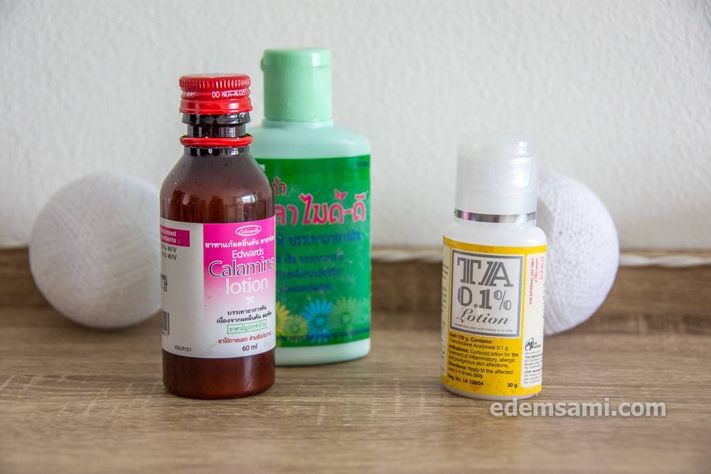 Впрочем, справиться с этой почесоткой просто: в любом 7/11 или аптеке продают лосьоны с каламином. Их много разных, подойдет любой. Почти все они имеют розоватый оттенок, поэтому, если не хотите выглядеть, как после гламурной ветрянки, берите те, что прозрачно-розовые (на фото – зеленый флакон). Правда, густые помогают лучше, на мой взгляд (на фото – коричневая бутылочка слева). Иногда прописывают триамцинолона ацетонид (желтый флакон), но это кортикостероид, и лично я не очень приветствую их использование без особой необходимости. Но помогает. Фенистил, кстати, тоже хорошо, а тайские бальзамы облегчают состояние, но не глобально. Каламин лучше, поверьте.