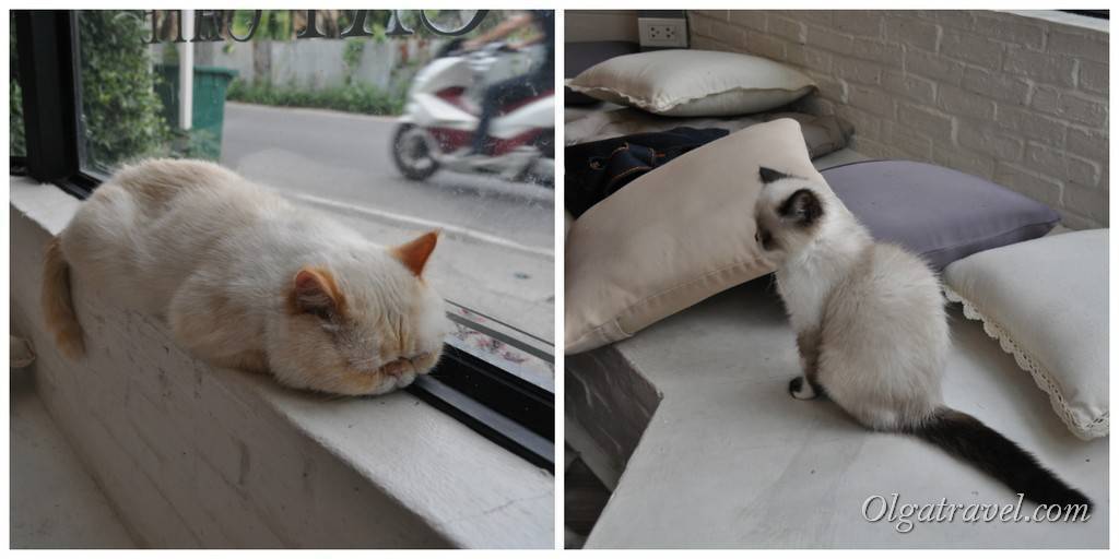 Я и не заметила, как провела в кошачьем кафе почти два часа! Надо сказать, что когда я уходила из кафе произошел небольшой форс-мажор. Несколько котов чуть было не покинули это прекрасное место! Я открыла дверь, что бы выйти, а они кааак рванут на улицу. Ох, ну я и испугалась! Там же рядом дорога, я испугалась, что коты попадут под машину или байк! Выбежала за ними босиком, а за мной работники кафе. Но коты оказались то ли умными, то ли боязливыми, но далеко не убежали, мы их благополучно выловили и отнесли назад в помещение, так что если вы еще думаете, что посмотреть в Чианг Мае, заходите в кошачье кафе The Something Like cat, они вас там ждут