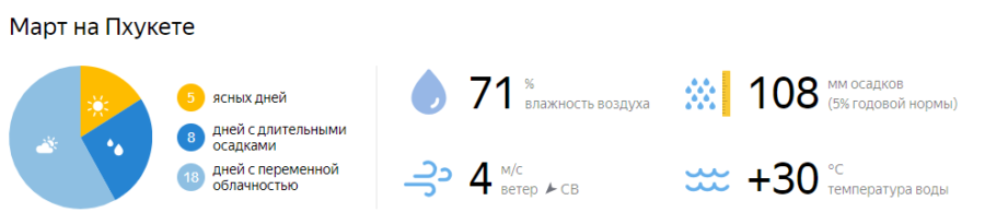 В марте тепло. Рай для пляжного отдыха. Дожди идут редко. Температура воздуха днем составляет +30-34°C, ночью — до +27-29°C. Морская вода у побережья популярных курортов — Паттаи, Краби, Пхукета нагревается до +28-30°C.