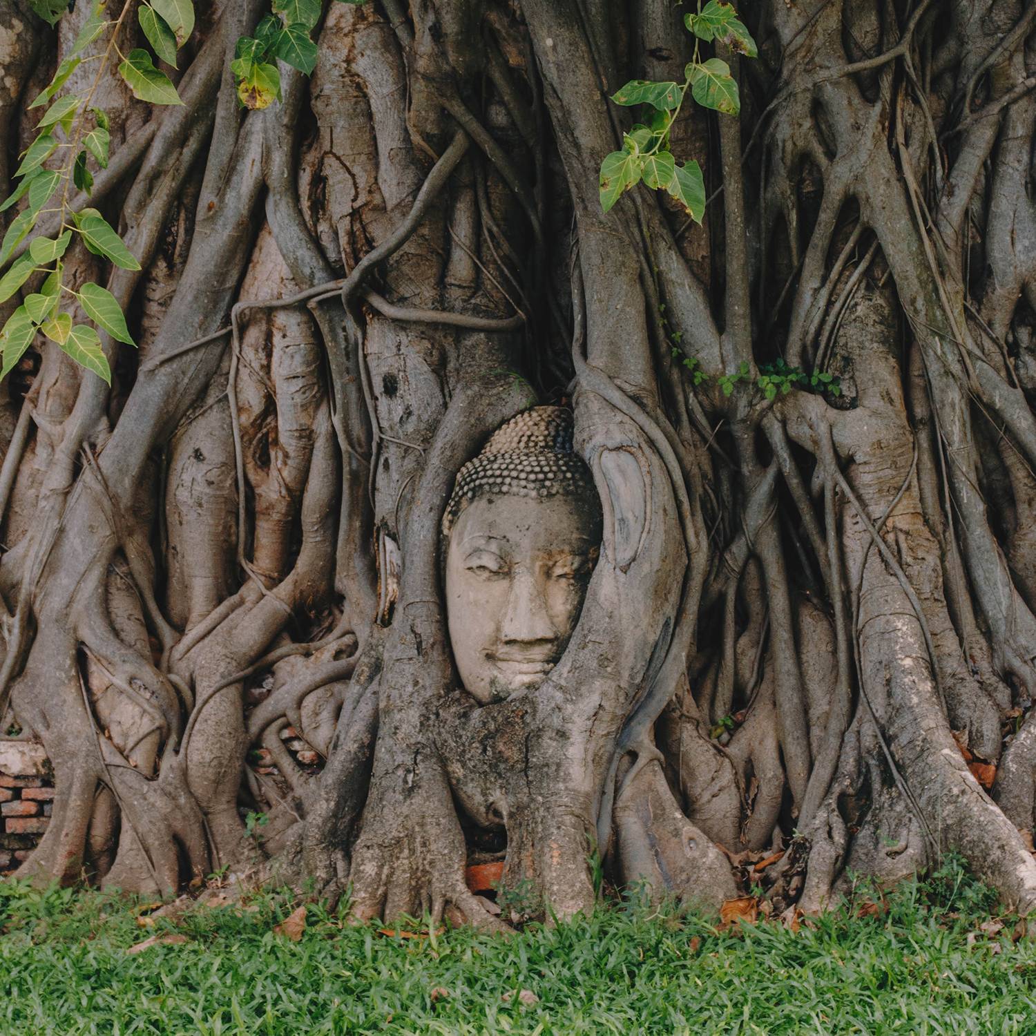Самый известный памятник Аюттайи — каменная голова Будды в корнях дерева. Она находится на на территории Wat Mahathat: 14.356634, 100.568425. По легенде, буддийские монахи закопали отрубленную бирманцами часть статуи под ближайшим деревом. Со временем фикус разросся, и голова поднялась над землей.