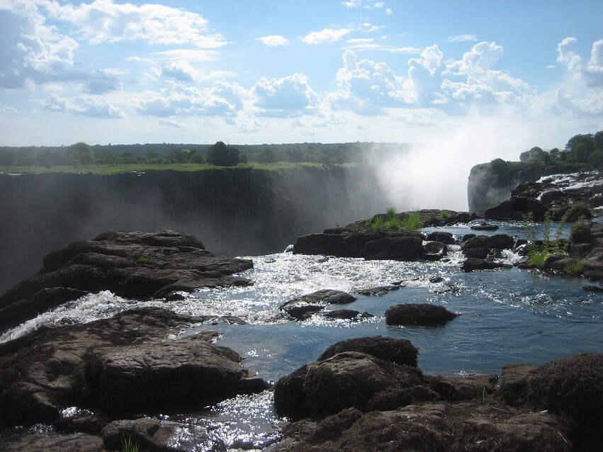 Водопад находится на юге Африки на реке Замбези и его удачное расположение позволяет любоваться потоком с противоположного берега узкого каньона, куда река с ревом обрушивает свои воды. Там есть площадки, подъездные пути и даже провели железную дорогу, чтобы смотреть на водопад можно было из окна поезда. А вот берег, на котором находится сам каскад, практически необитаем. К нему сложно подобраться и поэтому туристов там нет. Кроме одного места — маленького бассейна на краю водопада, природного омута, который приводит в трепет одним своим видом.
