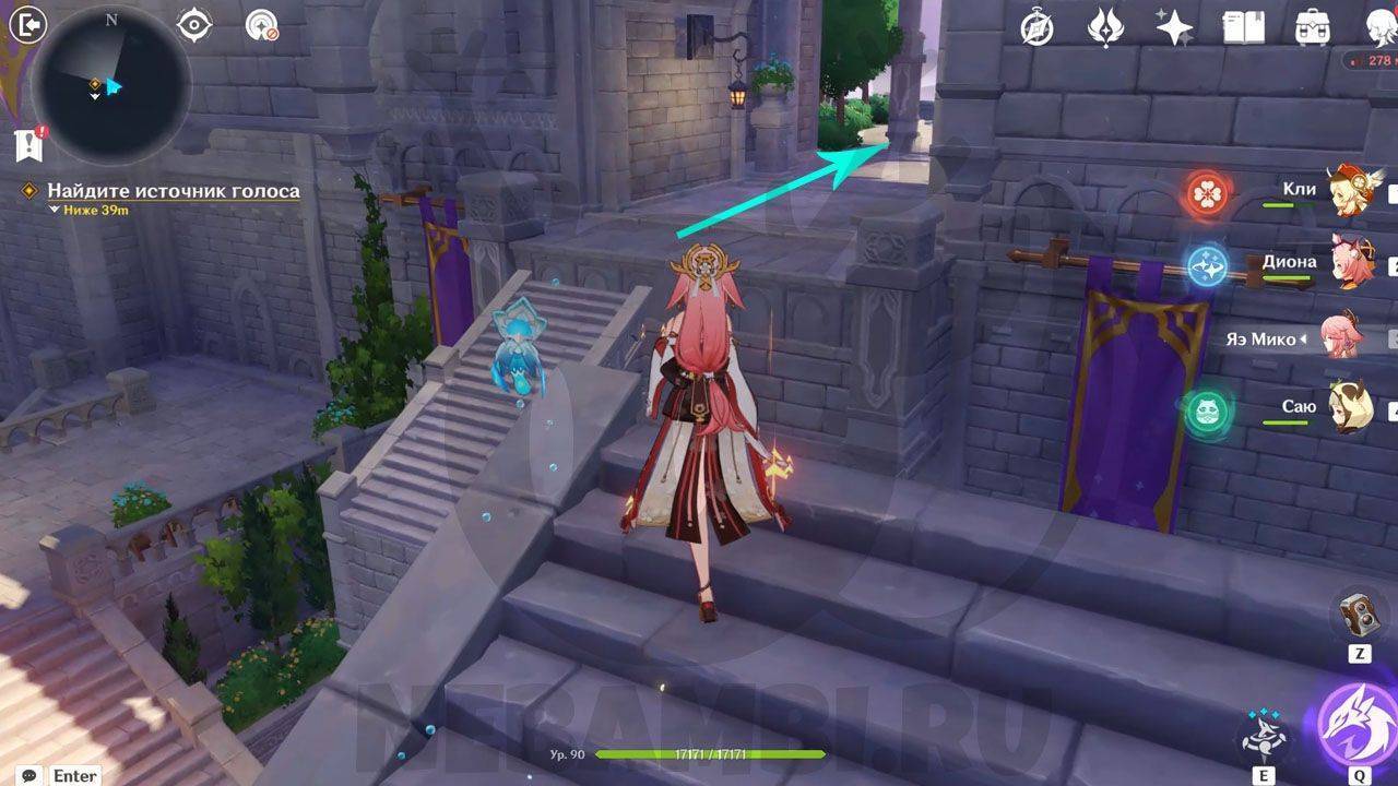 4-й страж. Двигайтесь на север. От телепорта при помощи светлячков поднимайтесь наверх, а затем бегите на юг. Вы должны добраться до точки, которая указана на карте.