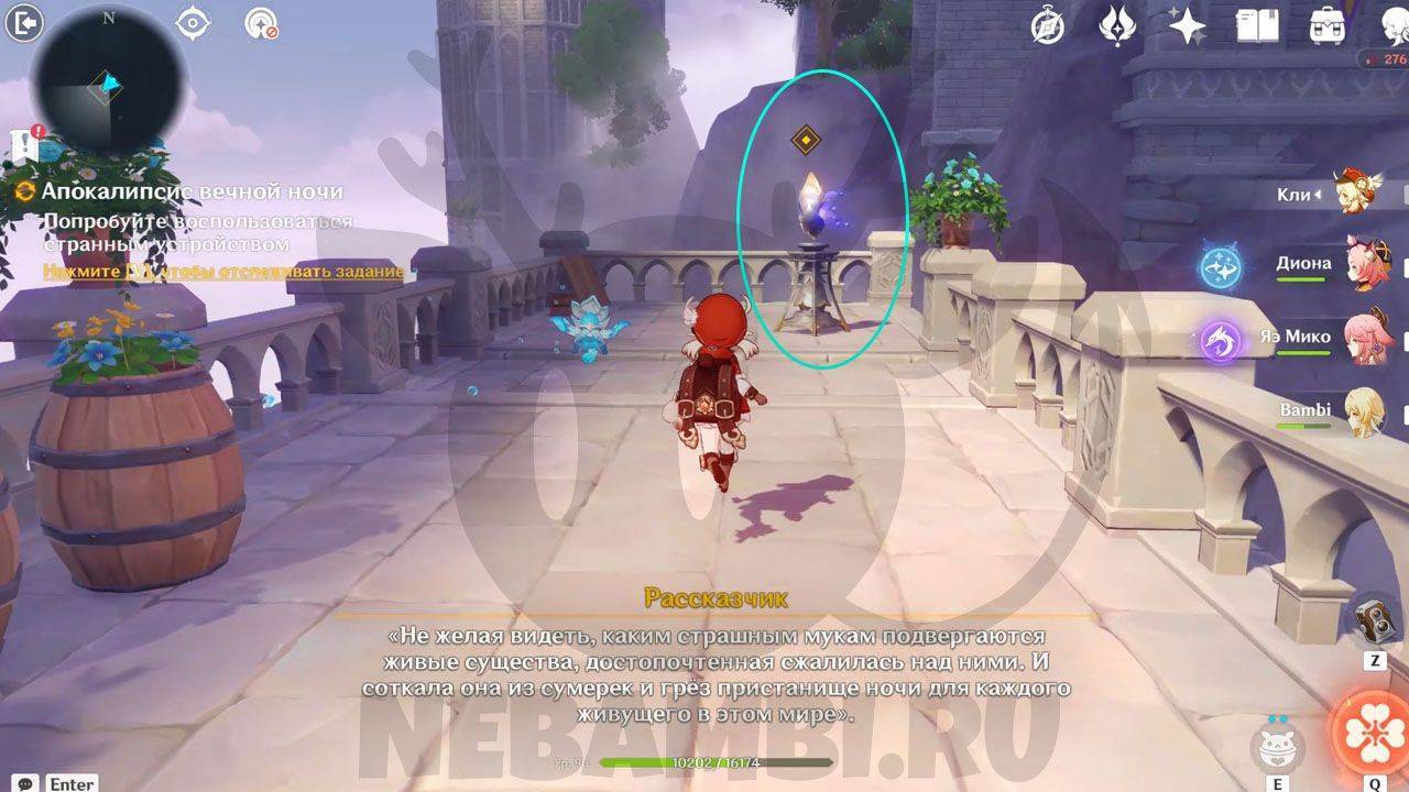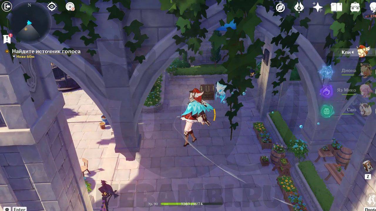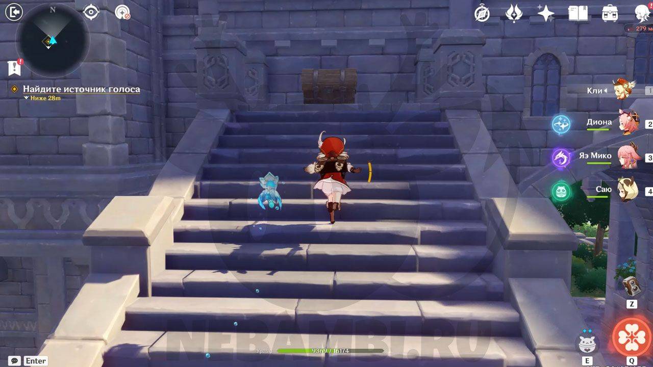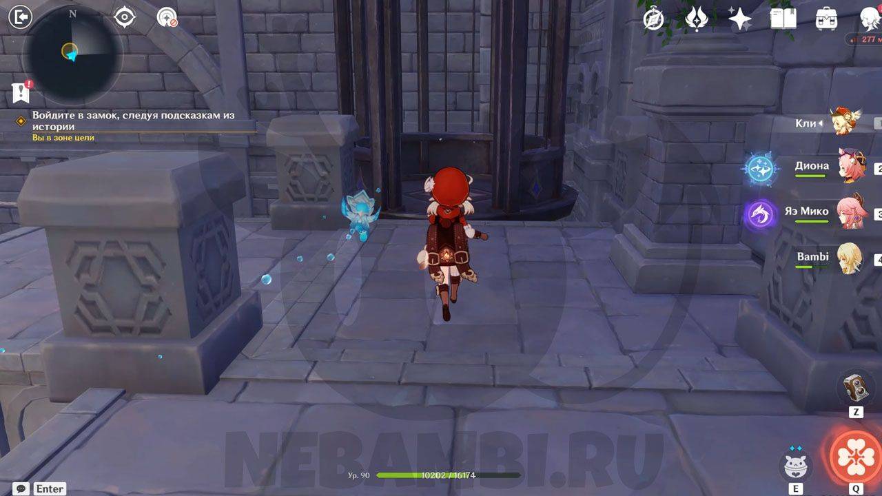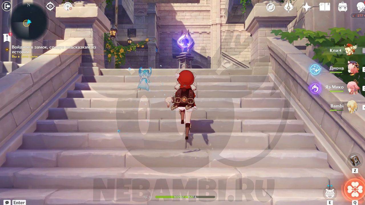 Сначала поднимитесь на лифте справа от врат, поднимитесь по лестнице справа и бегите к хиличурлам.