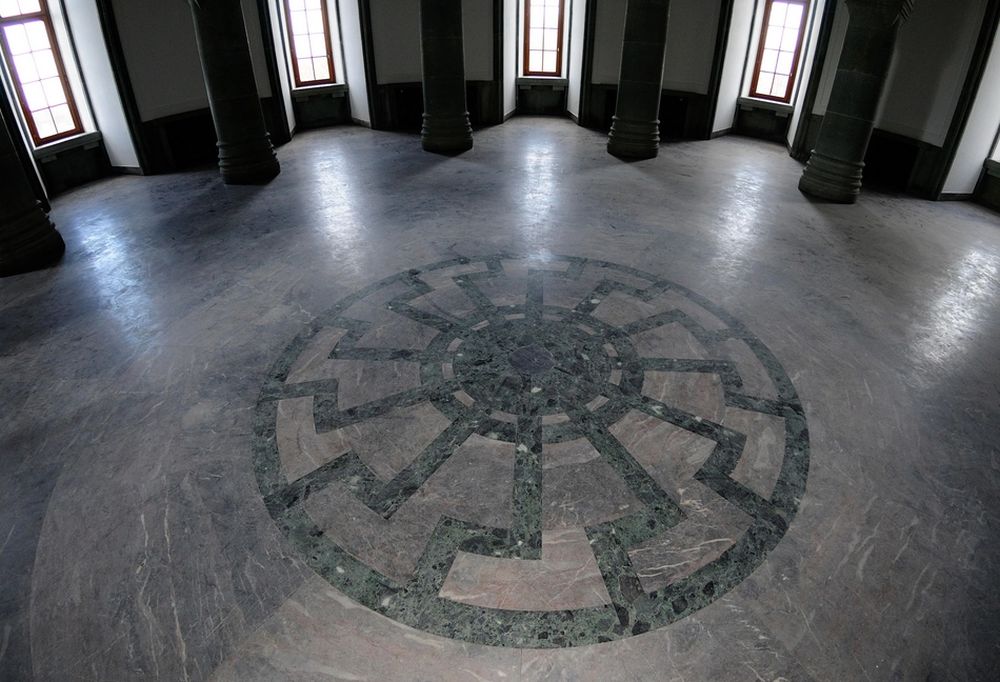 Комната гигантских размеров округлой формы с башнеобразным сводом, над которой возвышается Северная башня замка, украшенная личным гербом Гиммлера и рыцарскими гербами. По окружности помещения – 12 колонн, 12 дверей и 12 ниш для окон, по числу высших руководителей СС. На полу – каменная купель в виде 12-конечной мозаичной свастики, как 12 молний чёрного солнца.