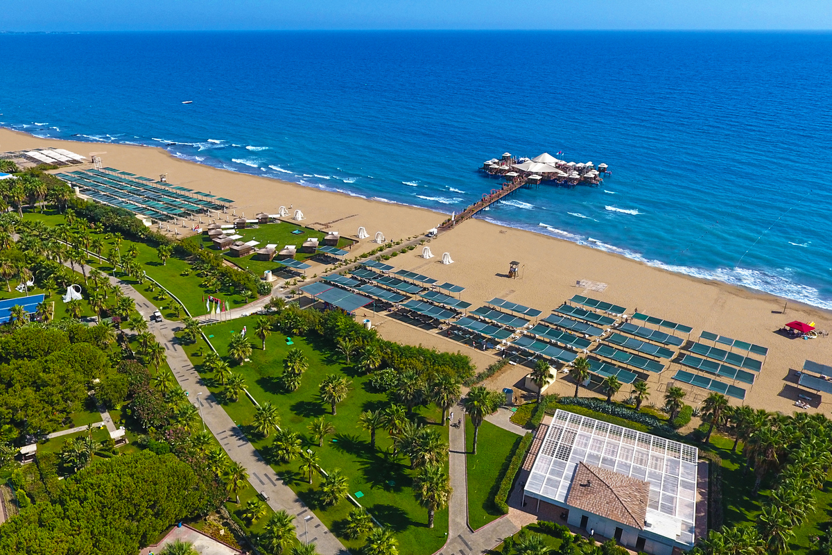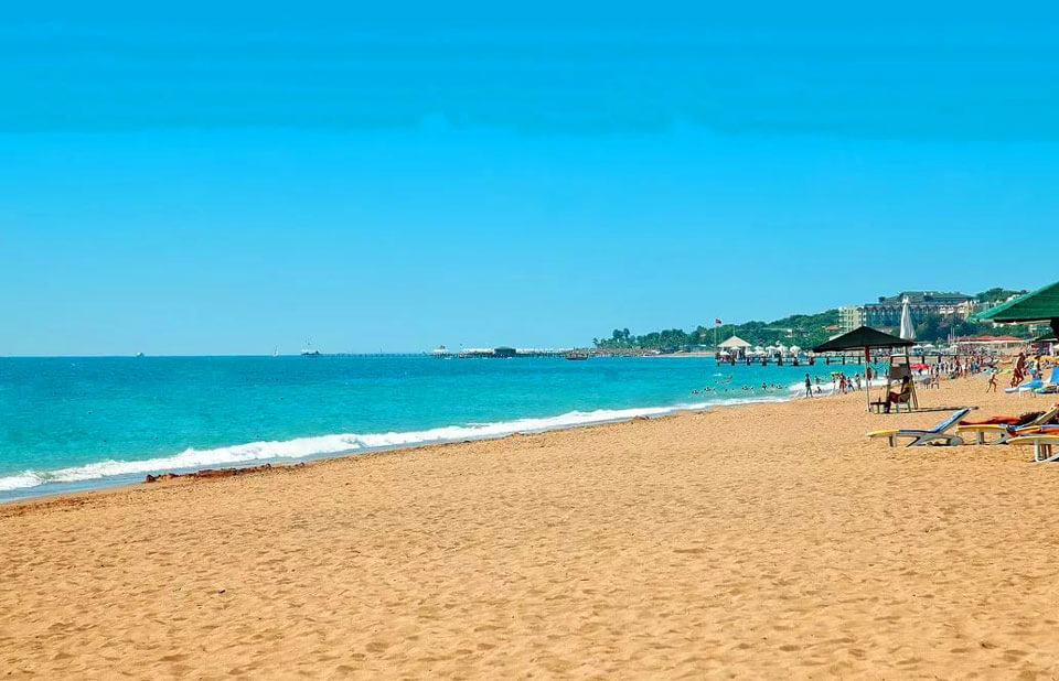Очень популярный отель в Сиде располагающийся в поселке Кызылагач. У отеля есть собственный песчаный пляж расположенный всего в 100 метрах. Гости могут бесплатно пользоваться инфраструктурой пляжа. На пляже есть пирс. Заход в море – галька.