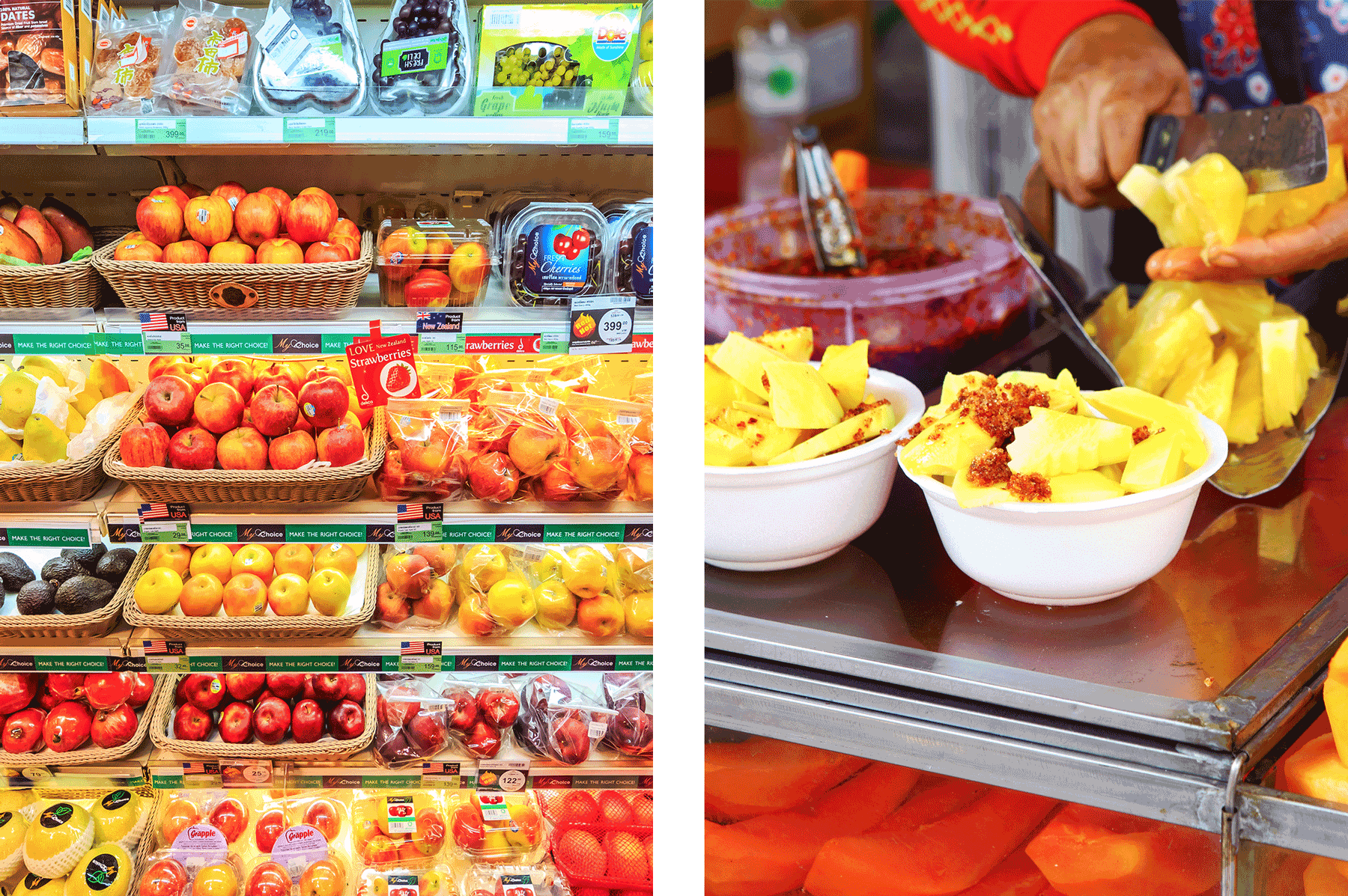 Если стоповер в Бангкоке ты делаешь по пути с курорта домой, имеет смысл купить тропических фруктов. Сделать это можно на уличных развалах или в супермаркете (например, Big C или 7- Eleven). Второй вариант будет чуть дороже (цена на манго отличается примерно на 10—15 батов, или 20—30 руб. за килограмм), зато в супермаркете фрукты будут более аккуратно упакованы, поэтому ты с большей вероятностью довезёшь их в целости и сохранности. Кроме того, в больших магазинах можно расплачиваться картой.