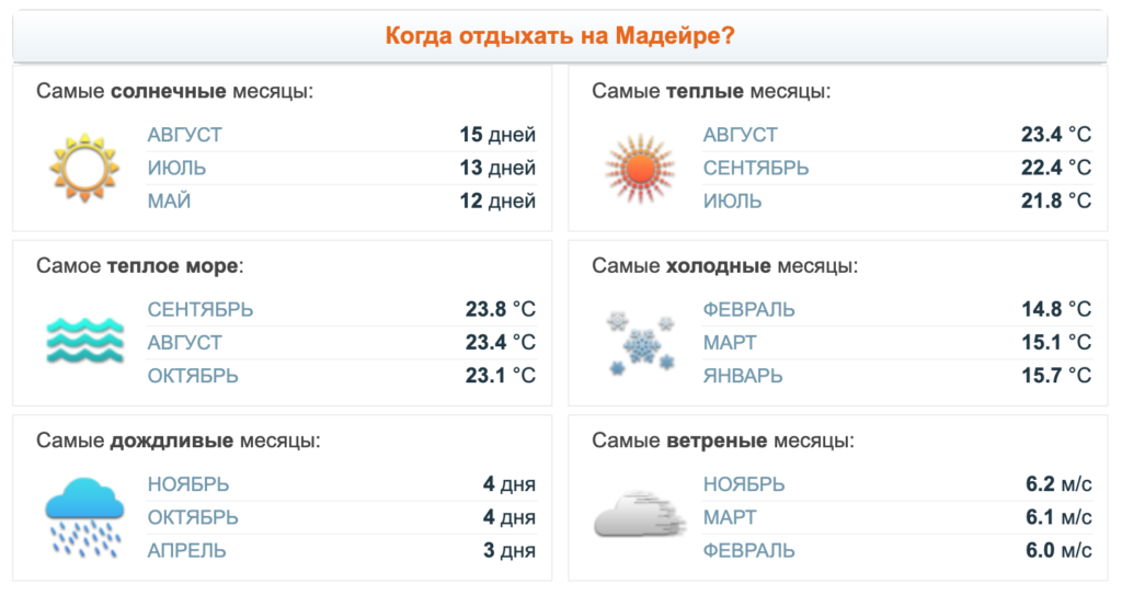 Субтропический климат Мадейры комфортен круглый год: независимо от сезона, температура воздуха здесь примерно одинаковая – от +17 до +25 градусов, воды от +18 до +22 градусов. Зимой чуть прохладнее, летом чуть теплее, также на зимний период приходится существенно больше осадков. Несколько различается погода в разных частях острова: северное побережье более дождливое, чем южное.